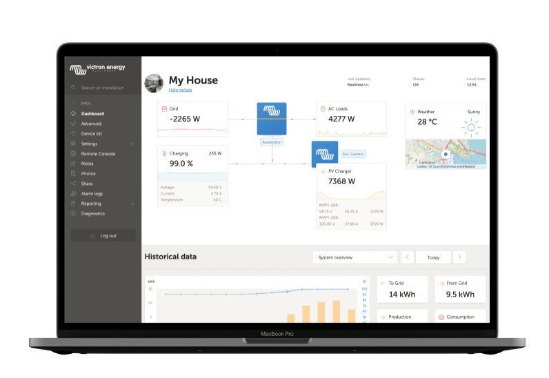 See what’s going on in real time with the GX Touch display from Victron, things like: